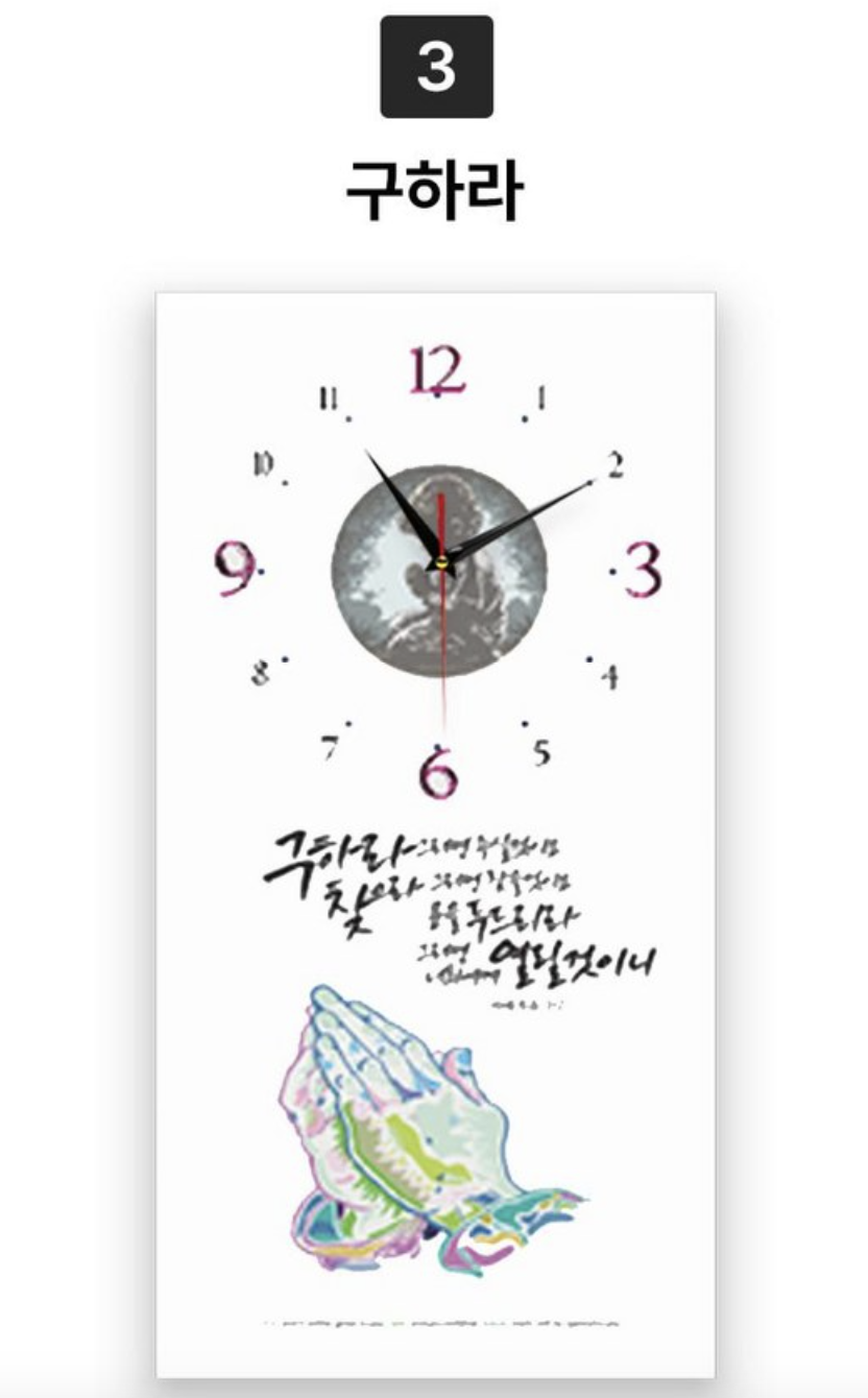 집에 시계를 바꿀 때가 돼서 찾아보다가 무소음으로 된 시계를 샀는데, 요즘은 이렇게 말씀 구절도 들어간 게 있더라고요. 그리고 하이그로시 소재로 된 제품이라 글로시하게 반짝이는 재질감이 좋더라고요.